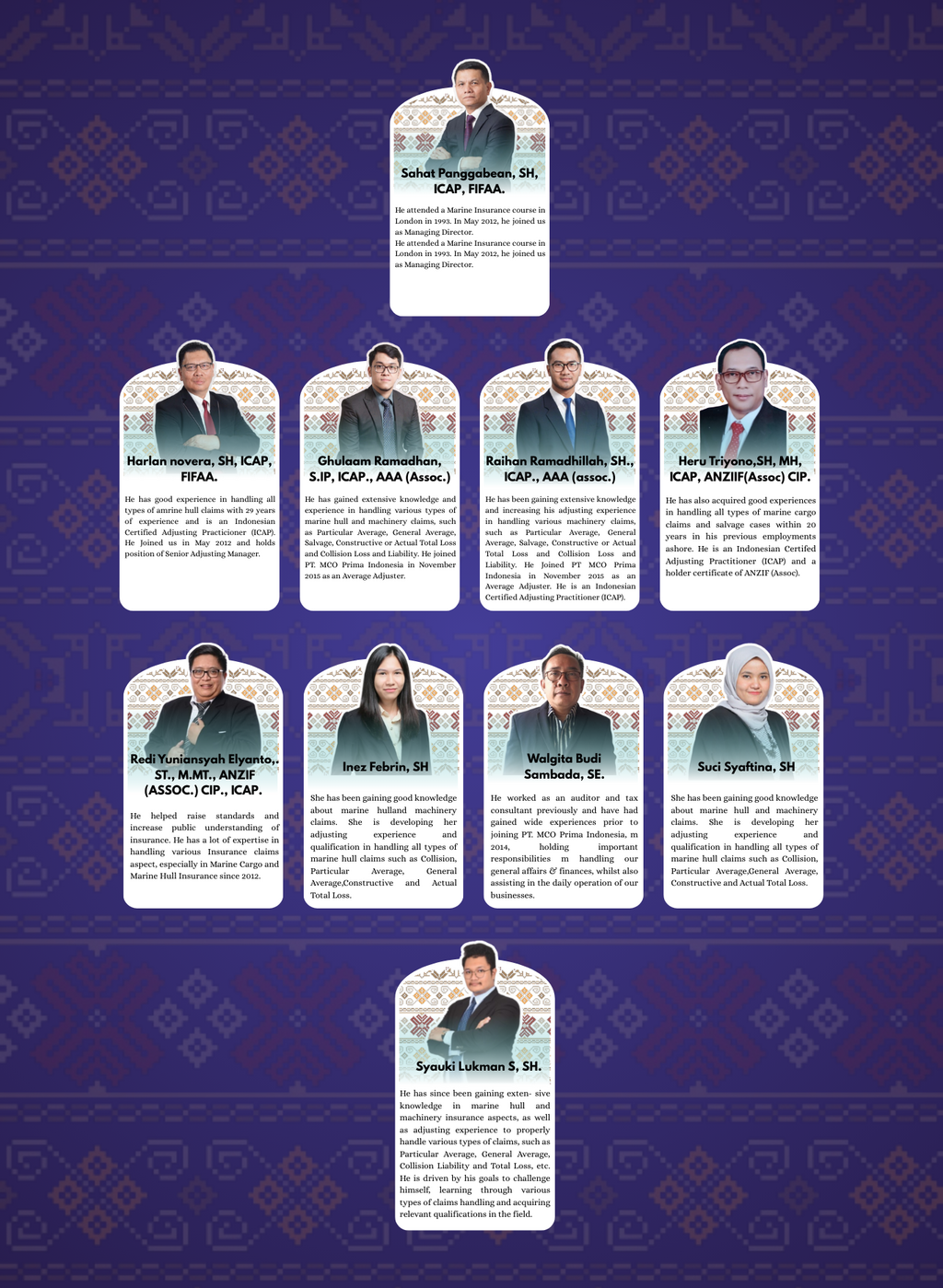 Established in 2012, PT. MCO Prima Indonesia has evolved and provided various services in marine claims industry. We are operating in association with International Marine Claim Consultant and Average Adjuster, which is headquartered in Singapore. With detailed knowledge of marine insurance law and practice acquired after years of experience and offer specialist resources to provide Marine Claims Advisory to the leading insurance markets of Southeast Asia and Average Adjusting services to the shipowning communities, especially in Indonesia.